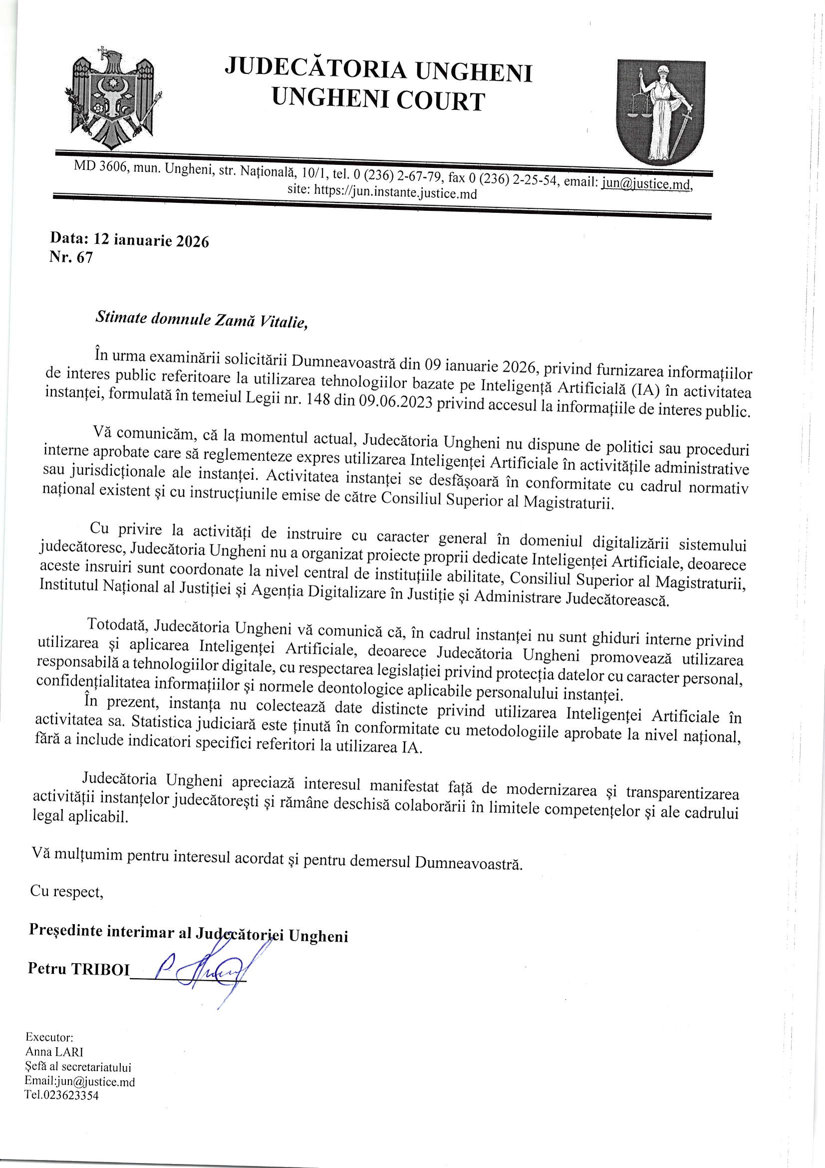 Aceasta este o versiune HTML a unui ataşament la solicitarea de acces la informații 'Inteligența Artificială la Judecătoria Ungheni'.
