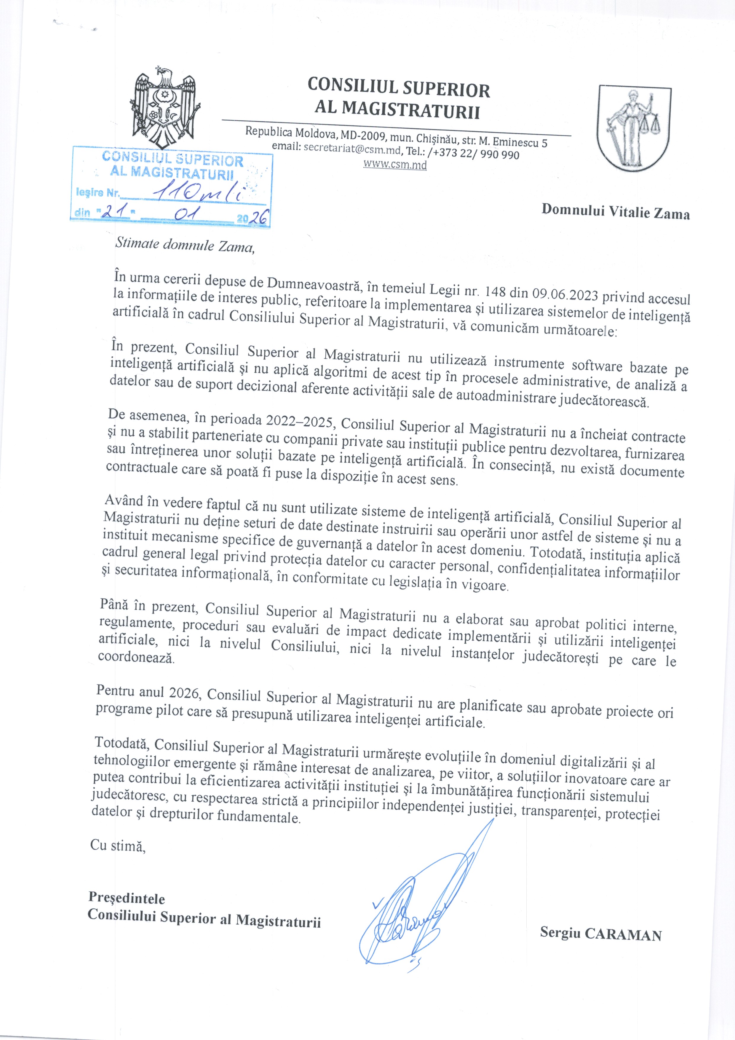 Subiect: cerere Acces la informaţie - Digitalizarea justiției și inteligența artificială: ce face Consiliul Superior al Magistraturii?